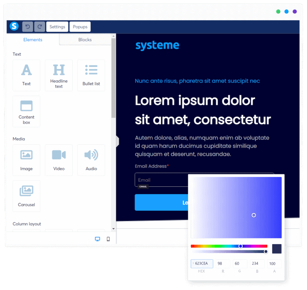 Systeme.io dispose d’un éditeur de page très simple à prendre en main, même si vous n’avez jamais fait ça auparavant. Il reprend le système de glisser-déposer qu’on retrouve sur diverses plateformes et vous permet de concevoir des pages de qualité.